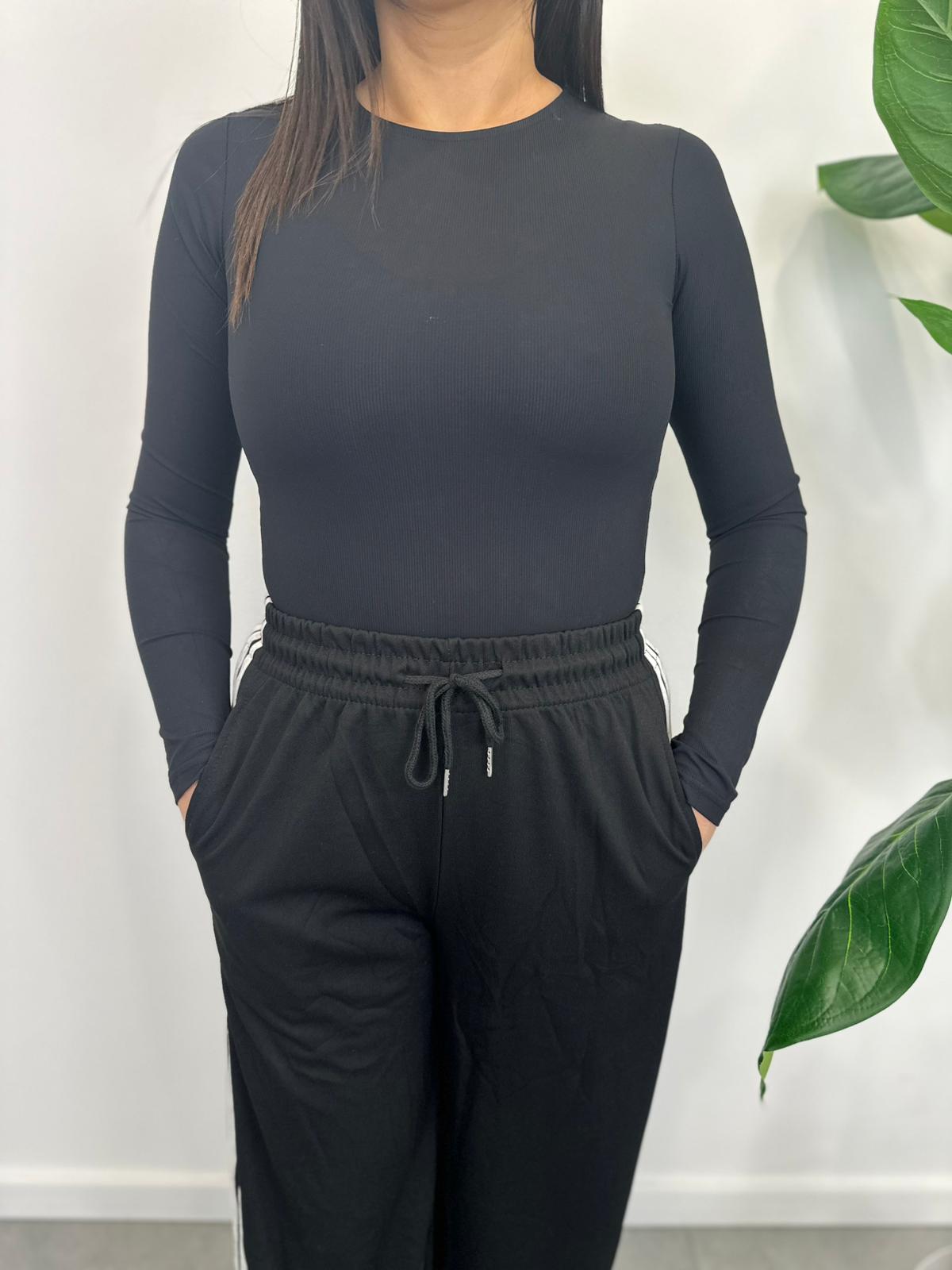 Un body girocollo a coste aderente, realizzato in 95% poliammide e 5% elastane, disponibile in taglie S-M e L-XL con differenze sottili, morbido, elasticizzato e perfetto per un fit impeccabile. Antonella è alta 1,60 ed indossa S-M.