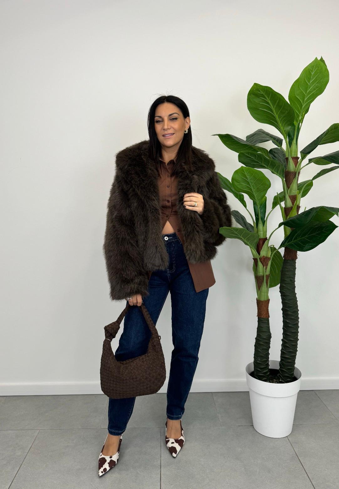 Una camicia marrone con drappeggi laterali, realizzata in tessuto 65% cotone e 35% poliammide, elegante e confortevole.