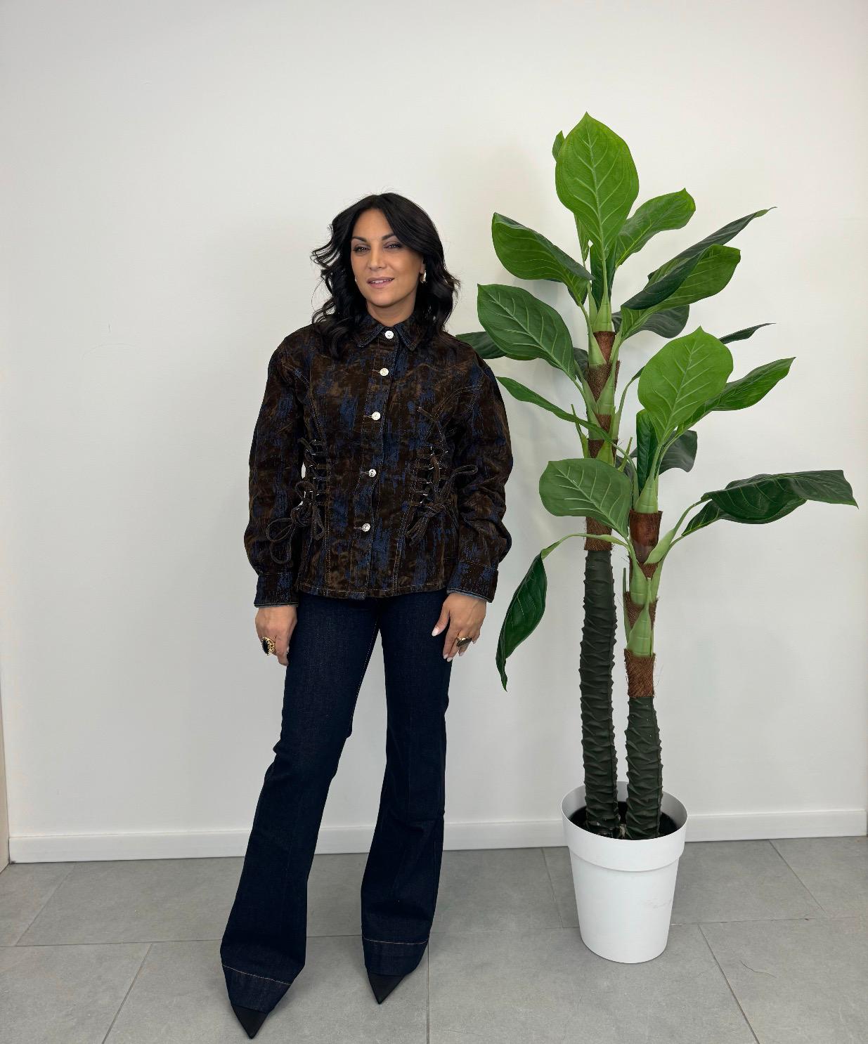 Camicia di Jeans con motivi in velluto marrone e laccetti regolabili in vita.