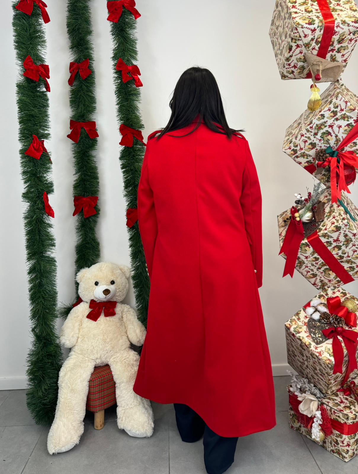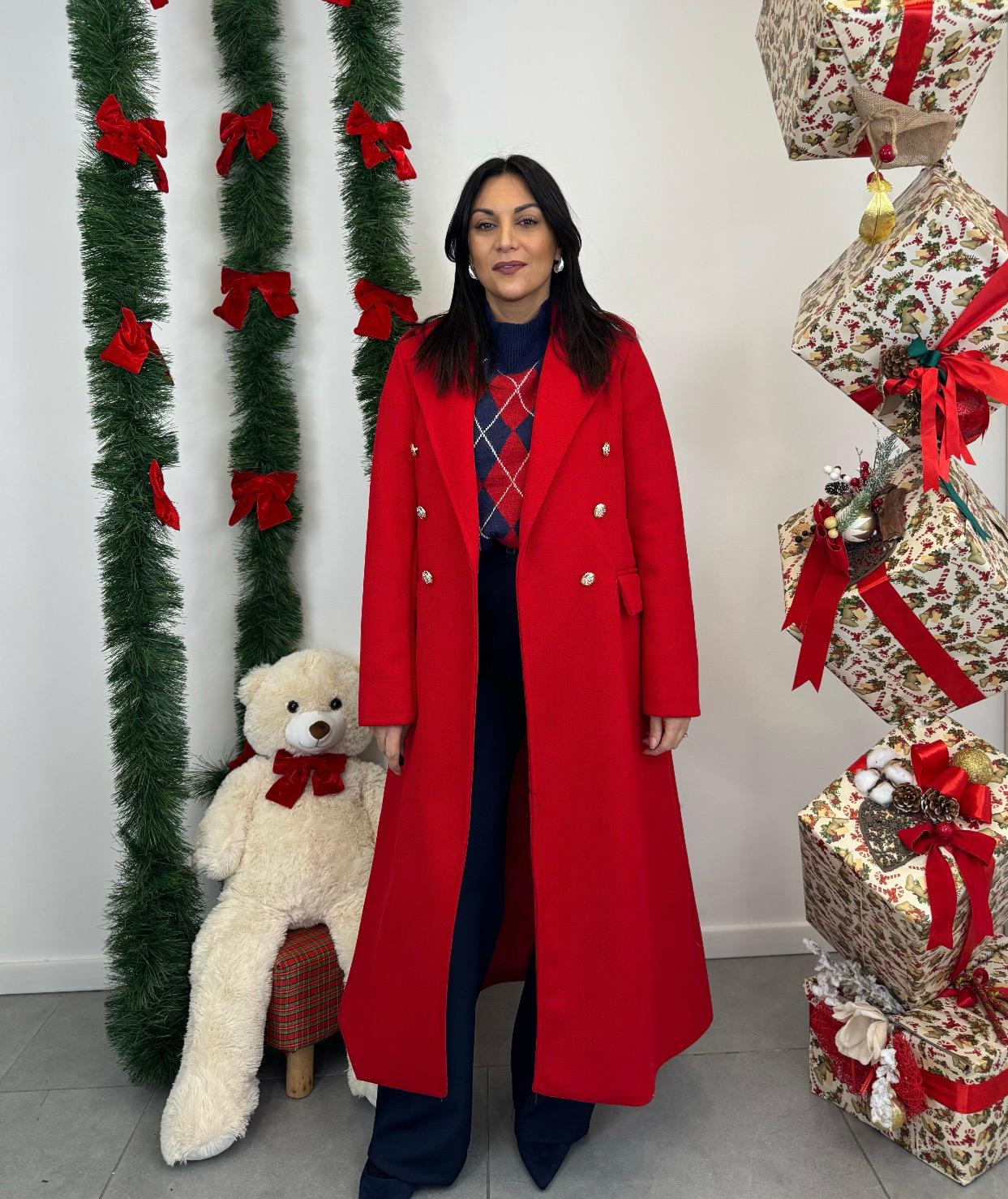 Cappotto lungo in panno, con bottoni dorati, stile classico ed elegante.