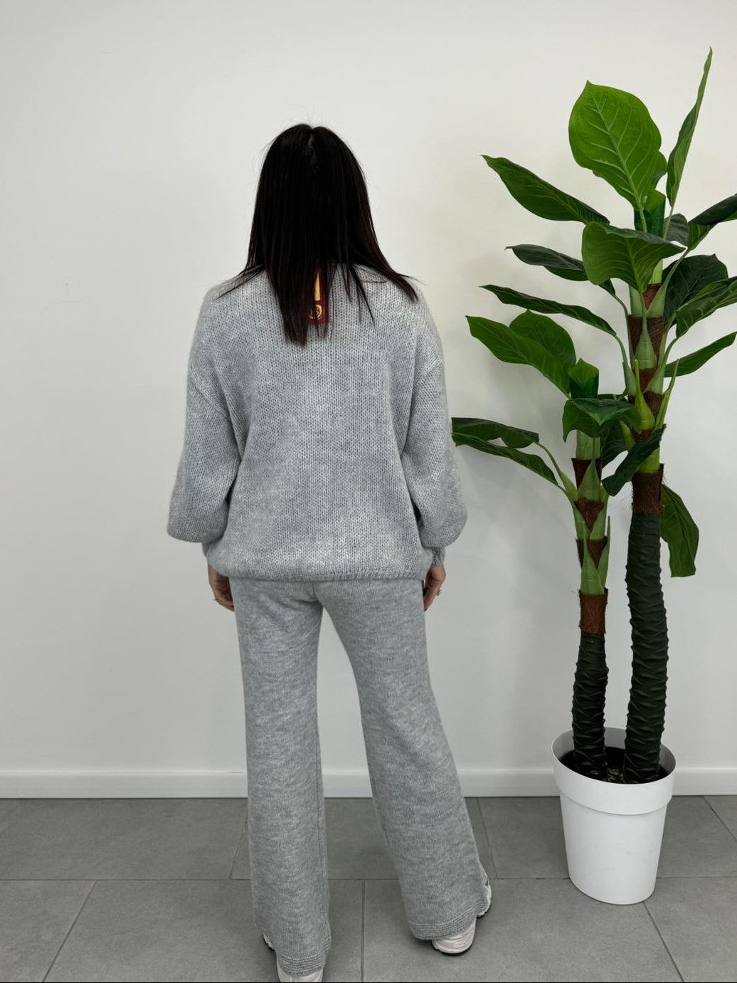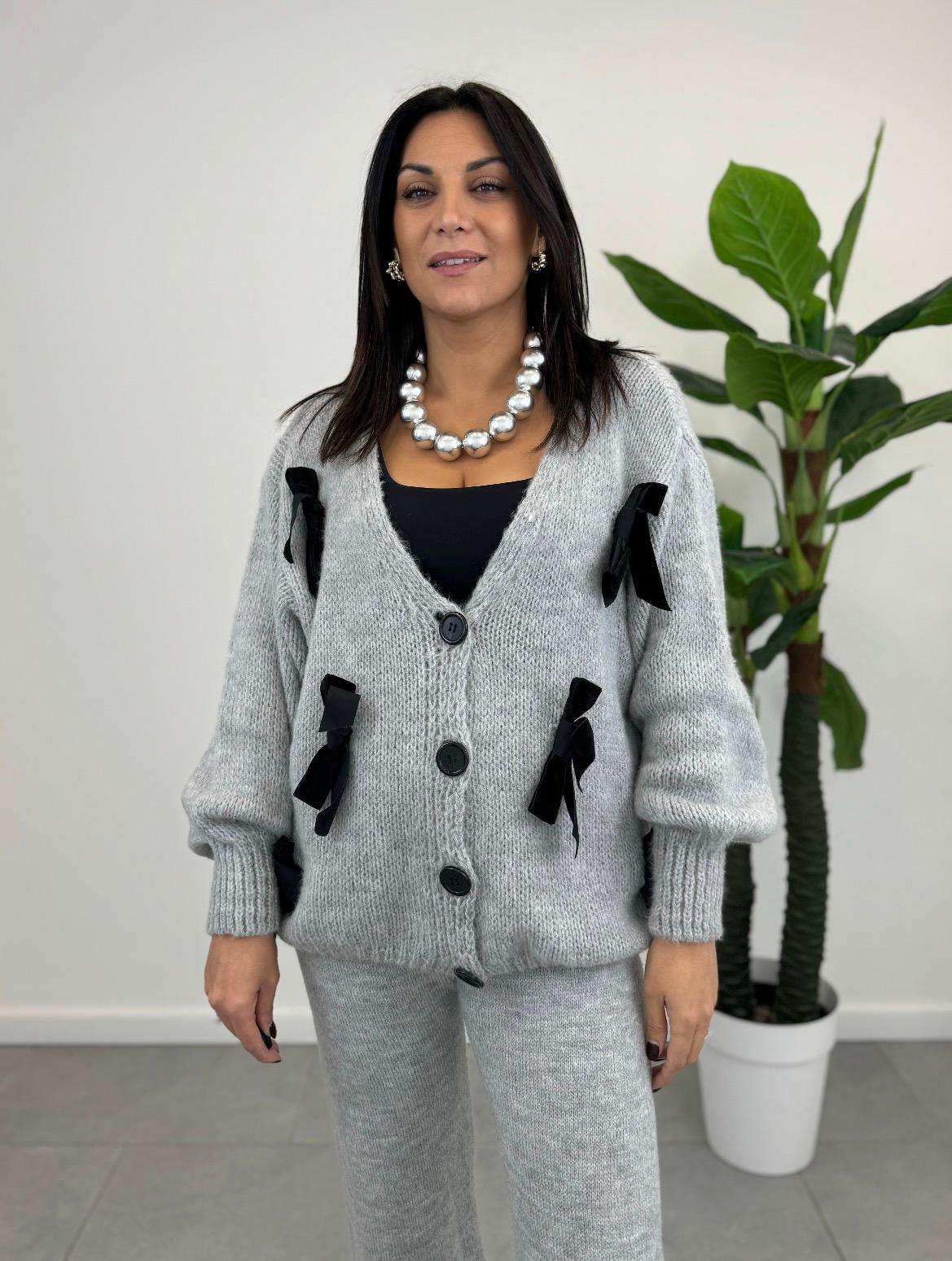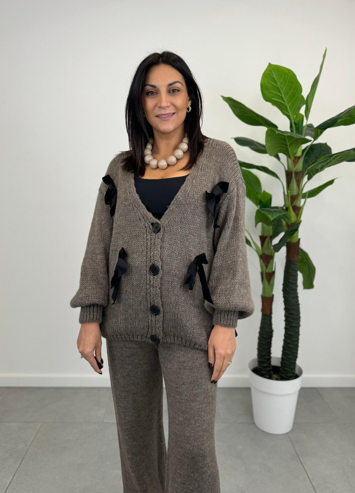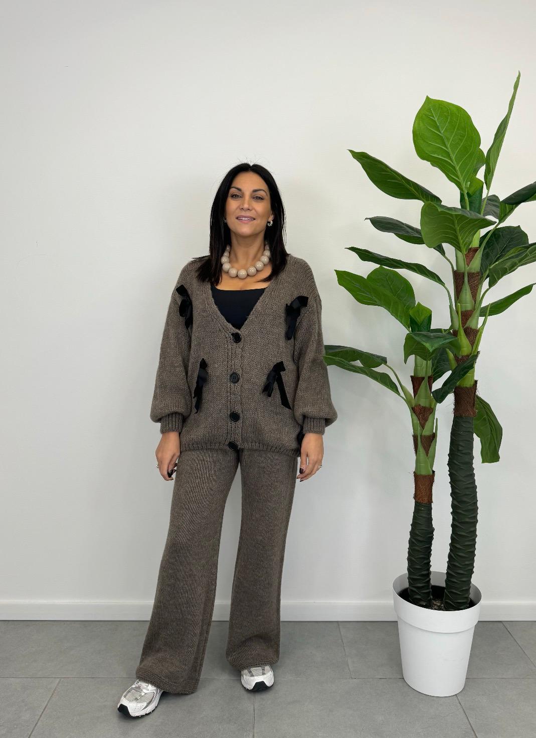 Coordinato composto da cardigan con applicazioni di fiocchetti in velluto e pantalone palazzo abbinato. Taglia unica, elasticizzato, veste bene da una S una L.
