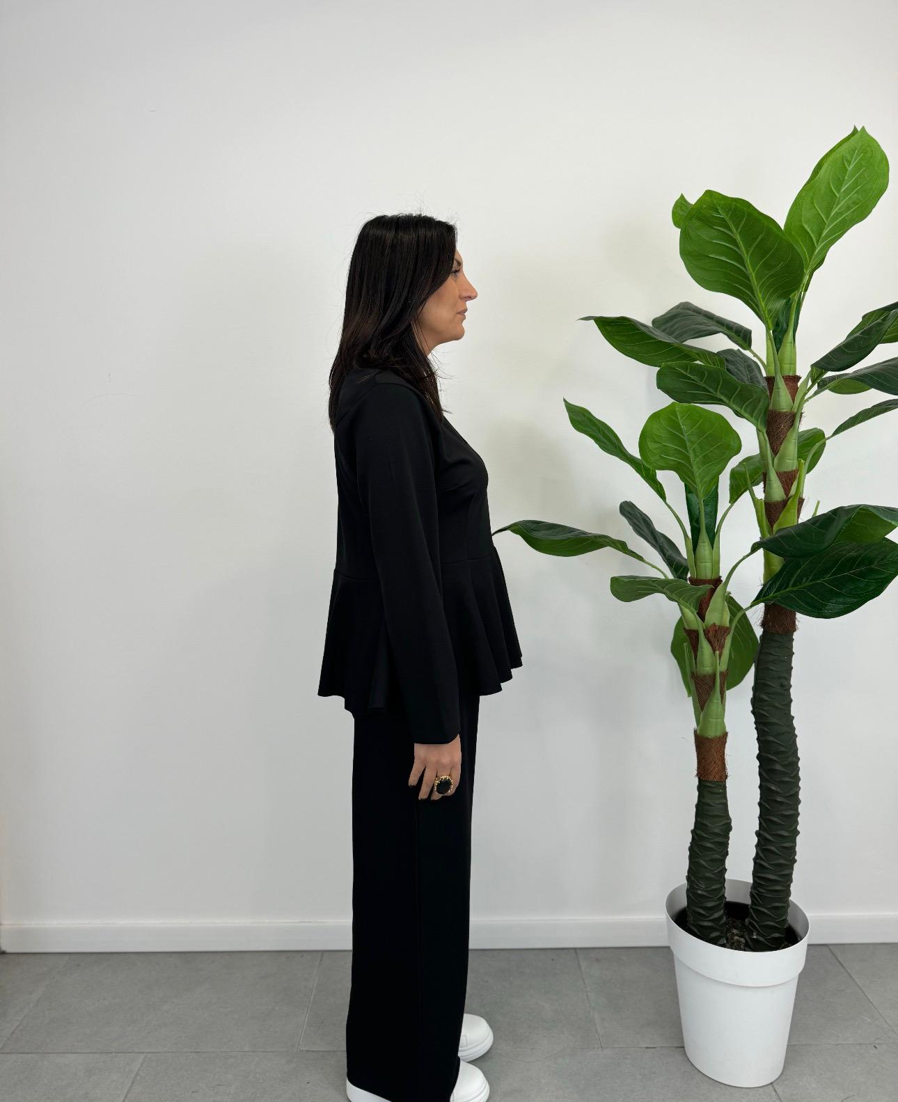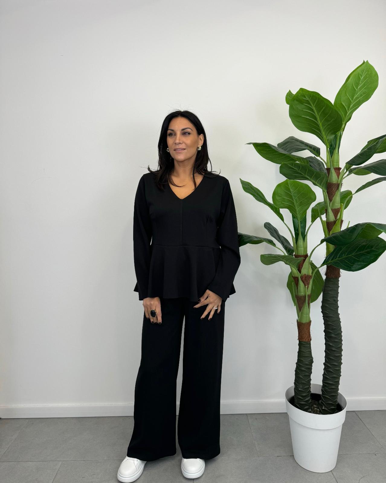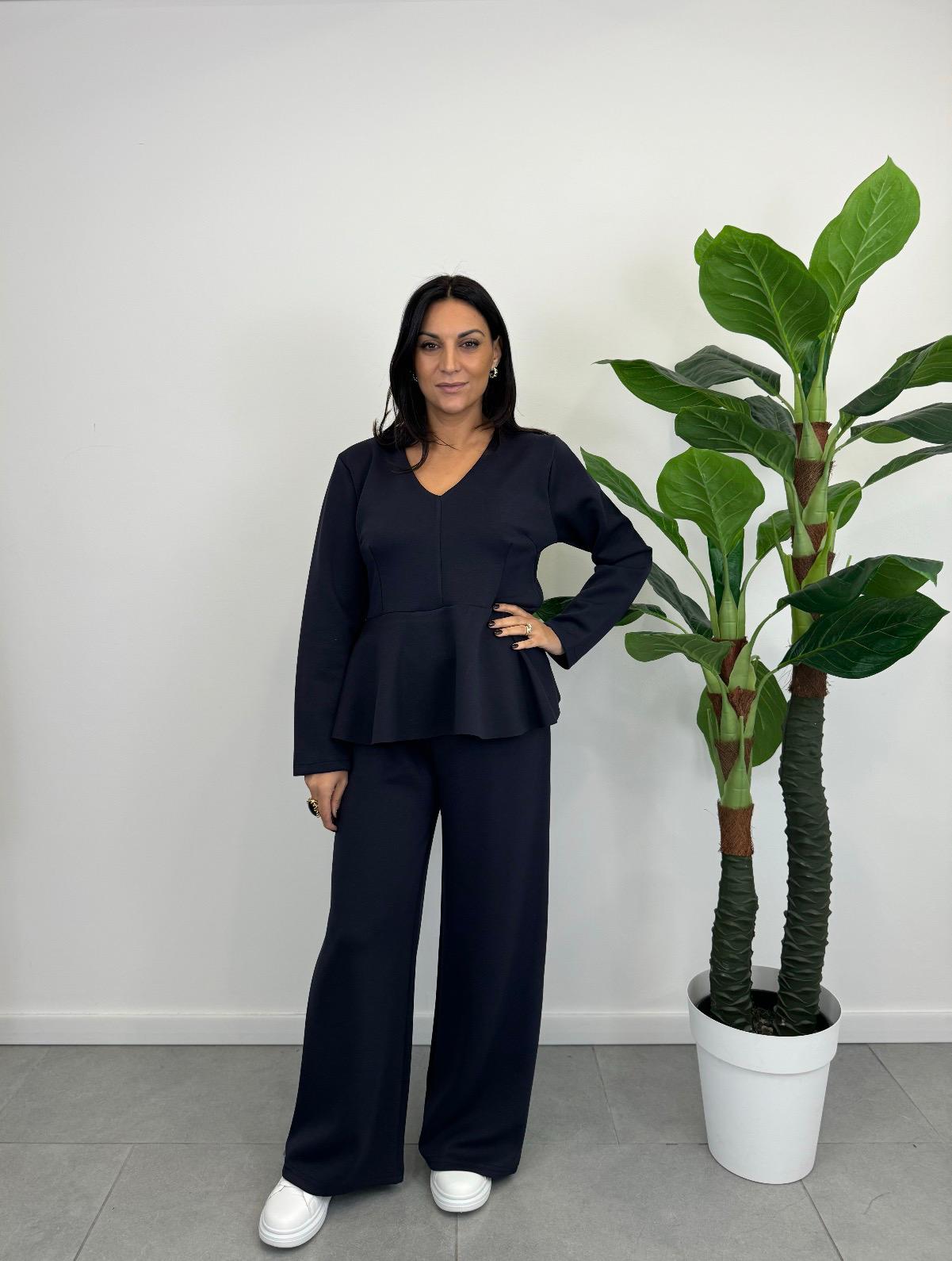 Coordinato due pezzi composto da maglia comoda con rouge, pantalone palazzo con elastico.
