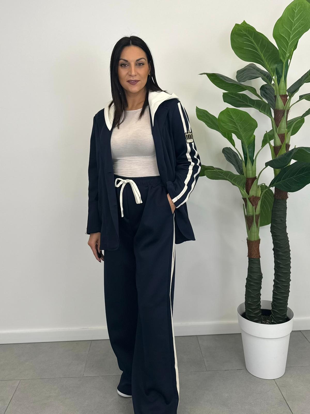 Coordinato composto da giacca in stile felpa con cappuccio e pantalone comodo, con una vestibilità rilassata. Disponibile in taglia unica nel colore blu.