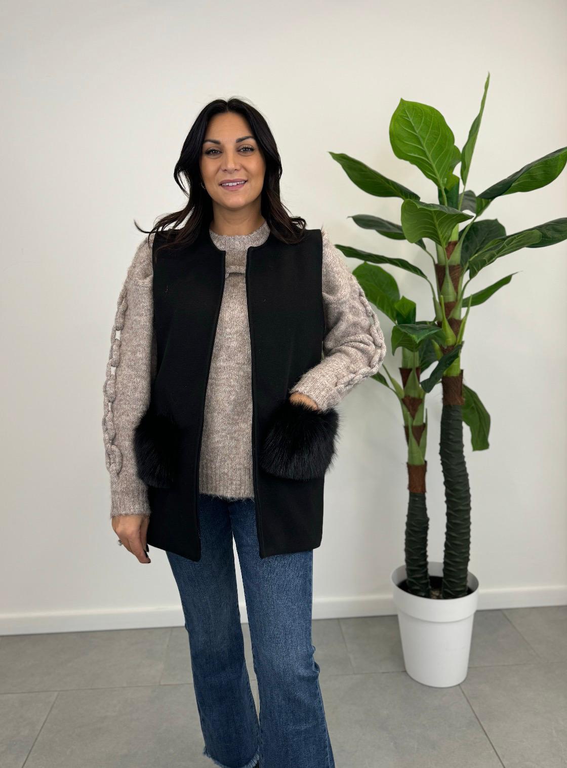 Gilet in panno con inserti in ecopelliccia, disponibile in nero, marrone e beige. Taglia unica, stile caldo e versatile.