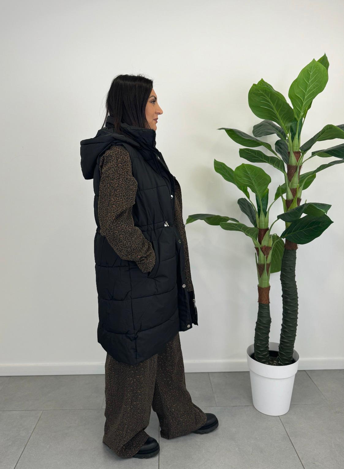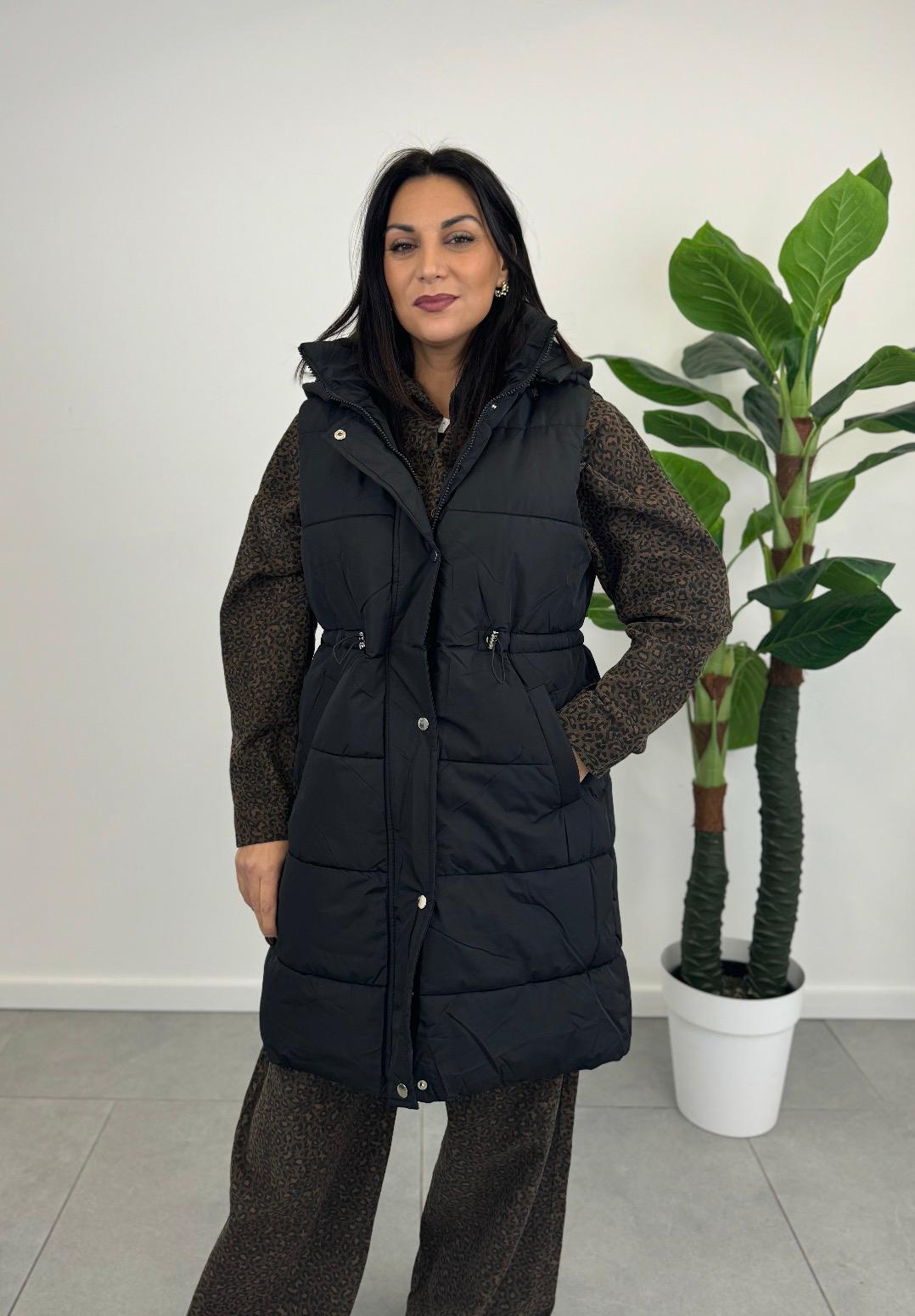 Il Piumino Smanicato da Donna è un capo lungo e imbottito, ideale per le giornate fredde. È privo di maniche, con una zip frontale che permette di indossarlo e toglierlo facilmente. Le tasche funzionali offrono praticità e stile, rendendolo perfetto per un look elegante e caldo.
