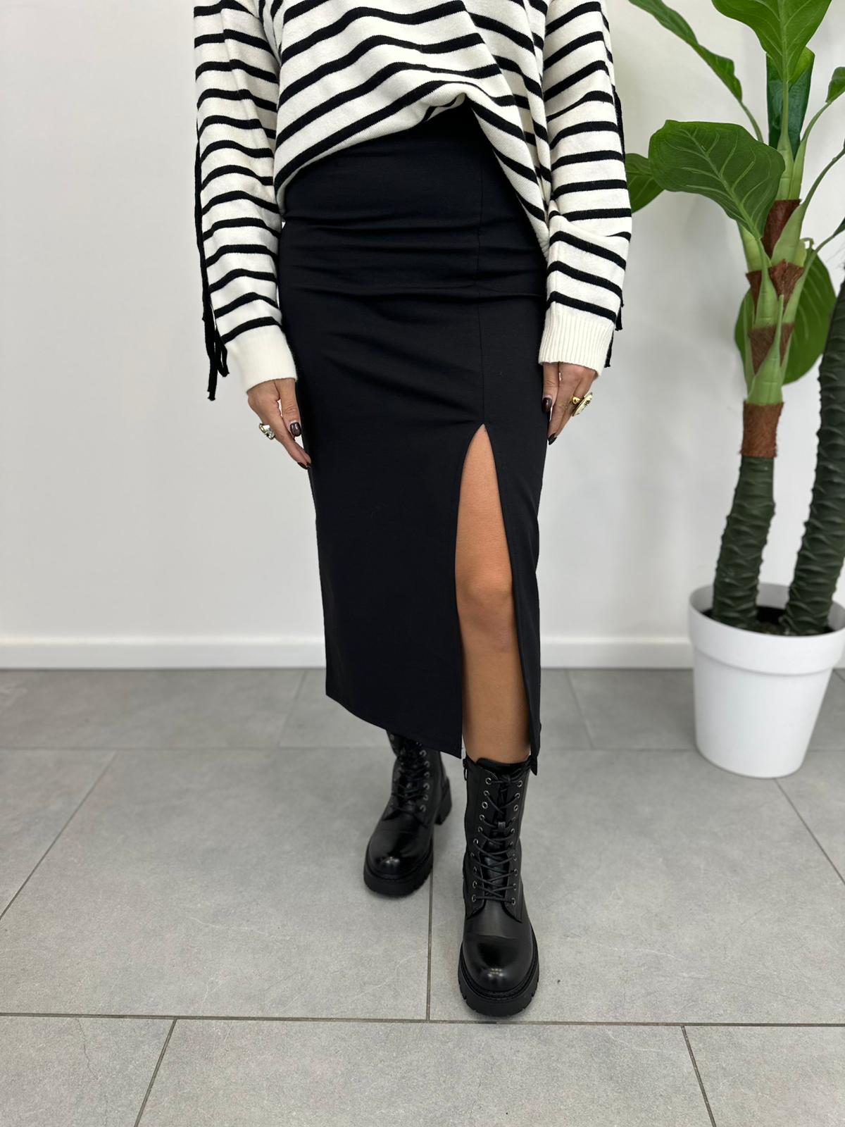 Gonna longuette midi con spacco, realizzata in tessuto elasticizzato che garantisce comfort e vestibilità perfetta. Taglia unica, si adatta facilmente a diverse silhouette, valorizzando le forme femminili. Ideale per occasioni formali o casual, questa gonna combina stile e praticità in un unico capo versatile.