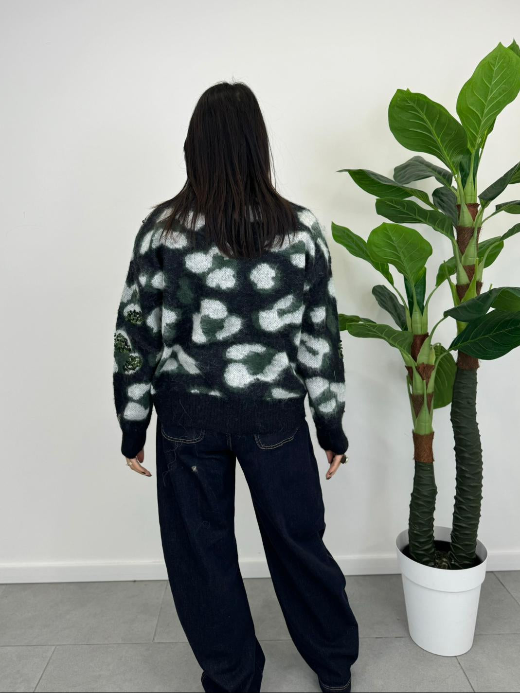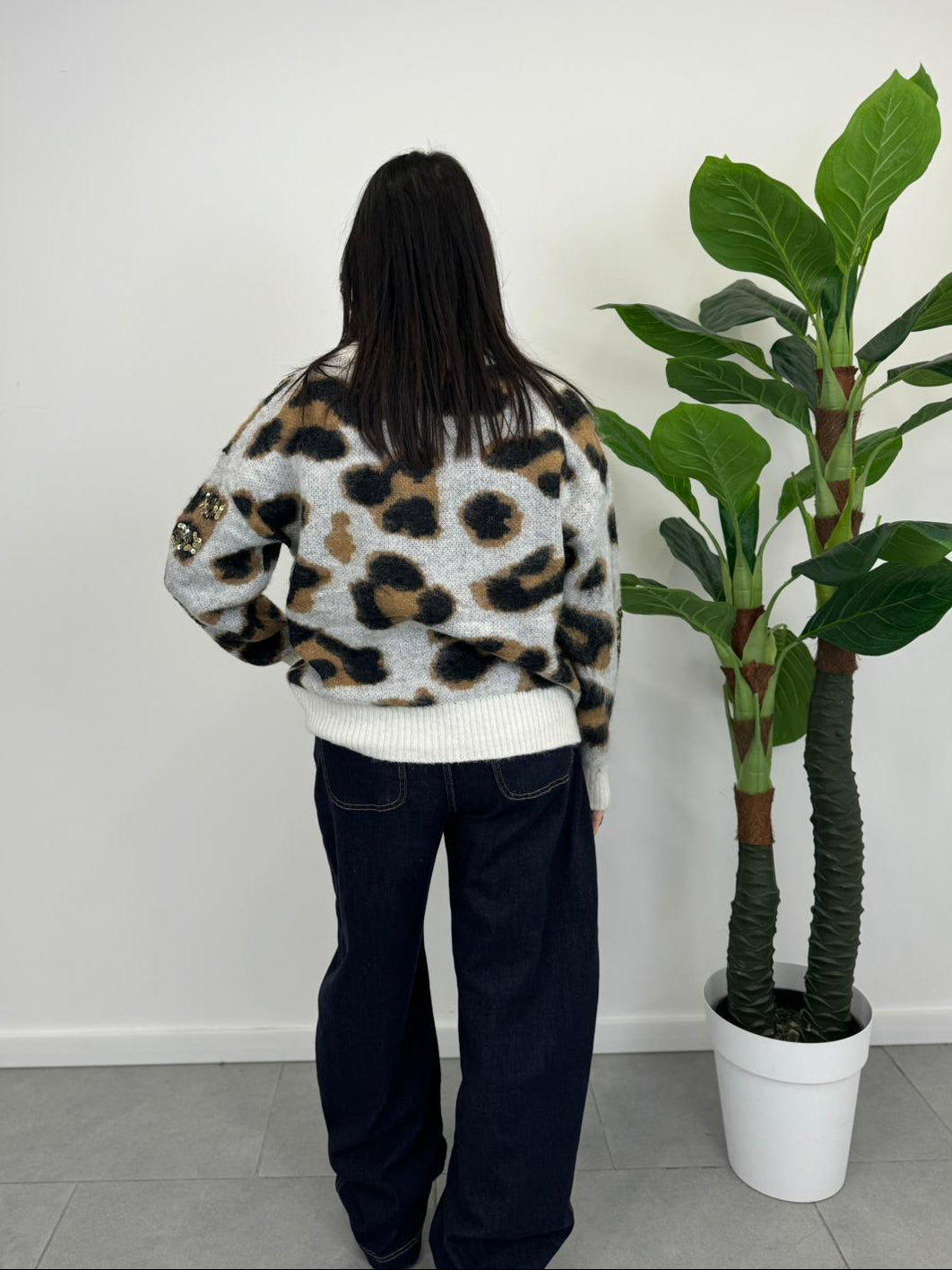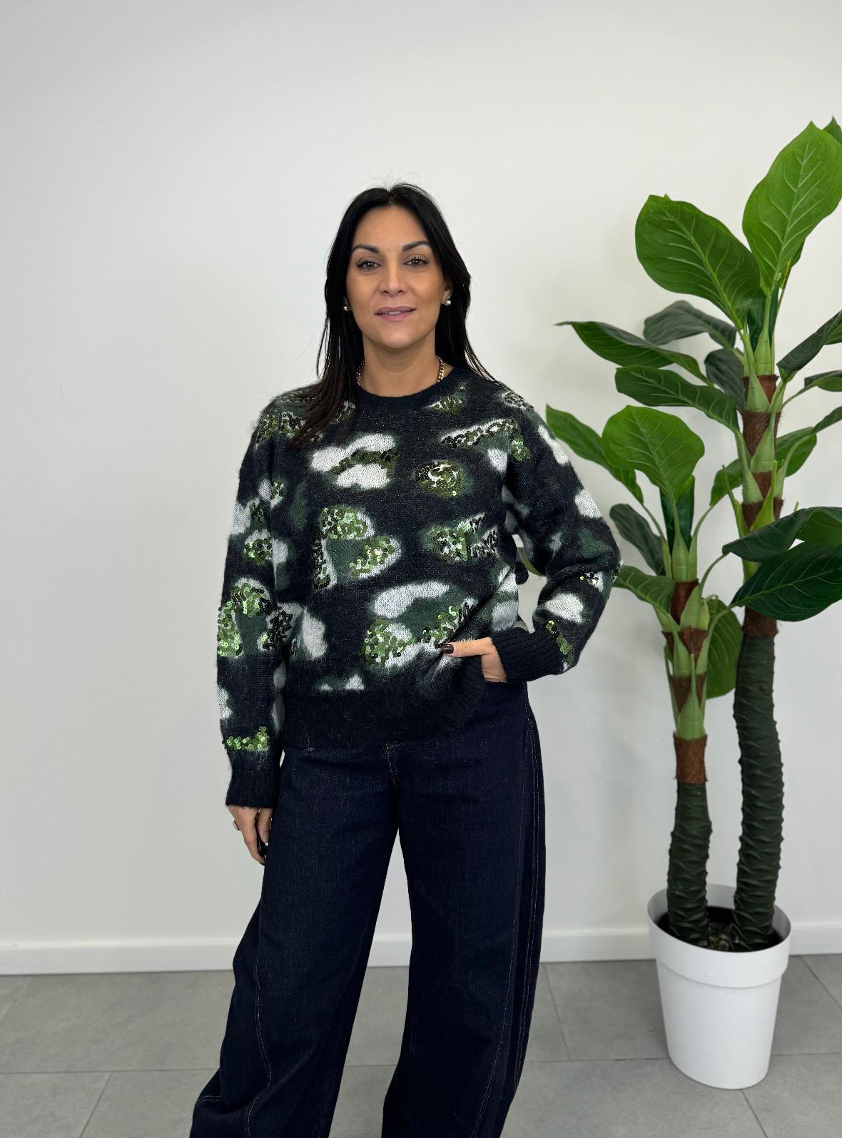 Il nostro elegante maglioncino maculato è perfetto per aggiungere un tocco di stile sofisticato al tuo look in quanto arricchito da dettagli di paillettes tono su tono che catturano la luce con eleganza, senza risultare troppo vistosi. Le paillettes sono finemente applicate, creando un effetto brillante e raffinato che si integra armoniosamente con il pattern maculato.