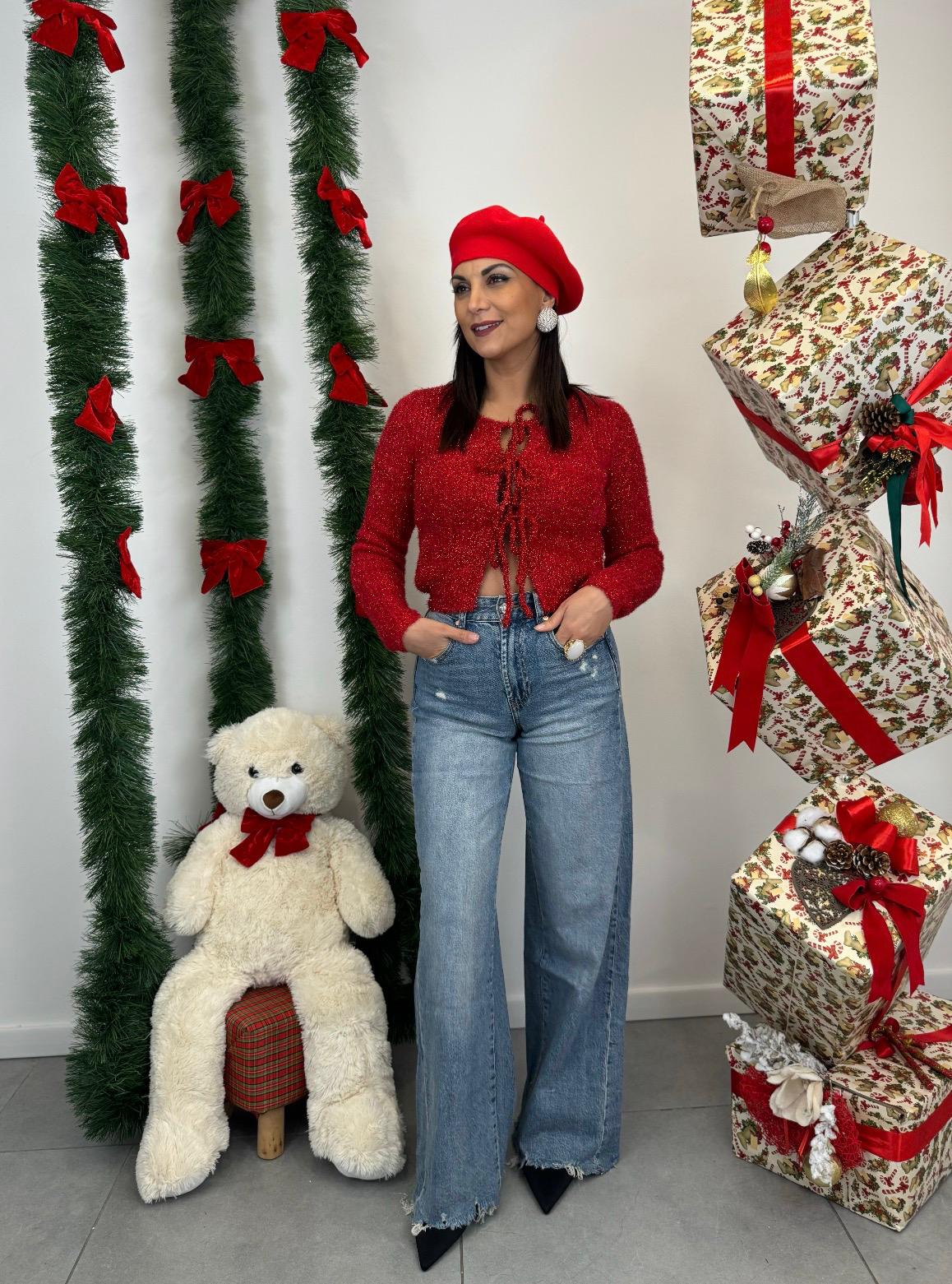 Un cardigan corto con chiusura a fiocchi in lurex, disponibile in diverse varianti colore, brillante e versatile, perfetto per un look elegante e trendy.