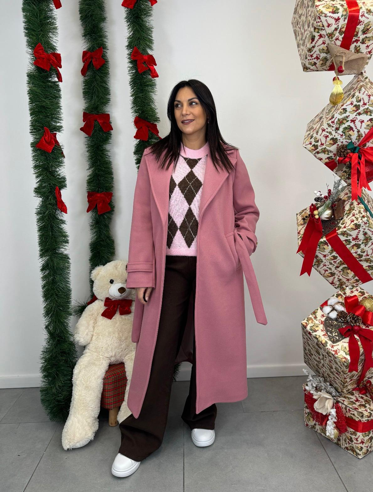 Maglione girocollo in lana e viscosa con motivo a rombi rosa e marrone, taglia unica.