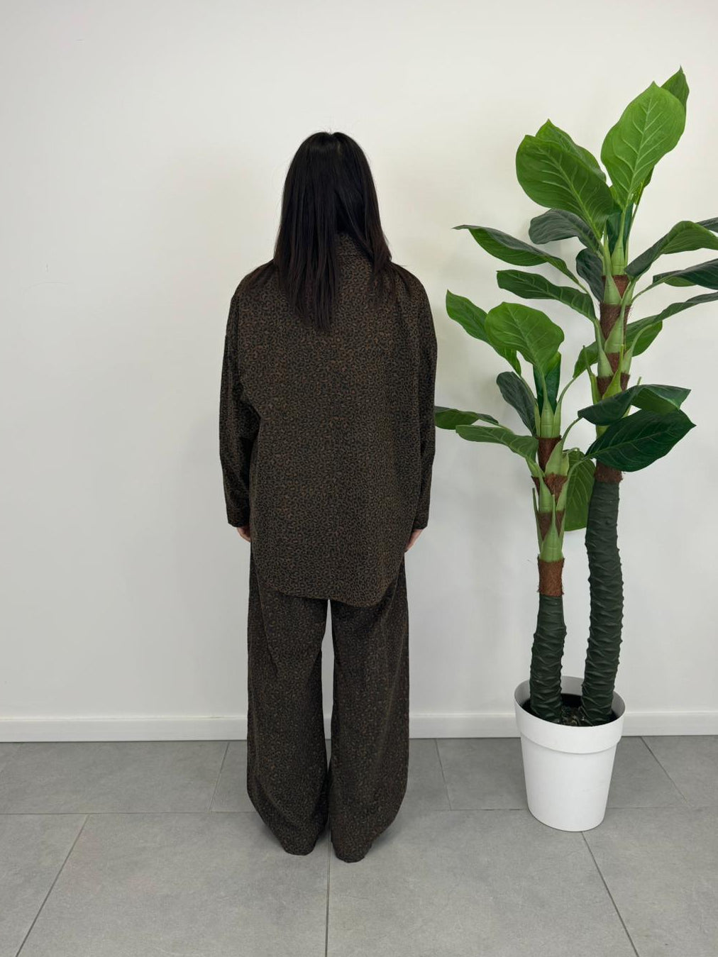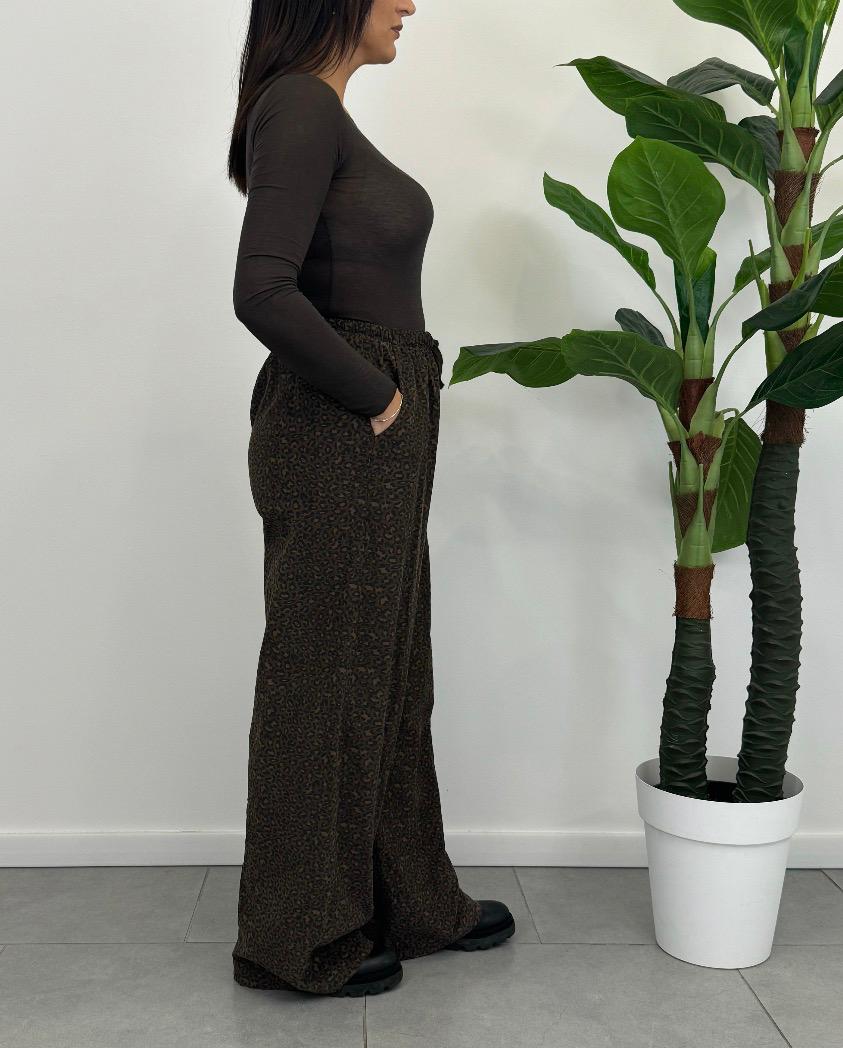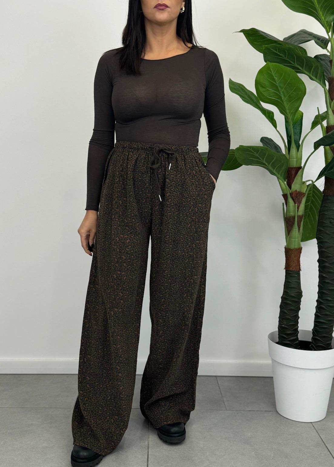 Pantalone animalier a palazzo con coulisse regolabile in vita, comodo e versatile, perfetto da abbinare alla camicia coordinata. Taglia unica.