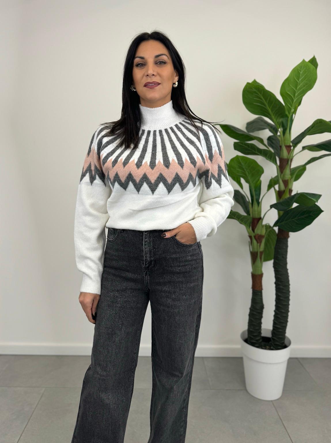 Un maglioncino comodo, a mezzo collo, con una fantasia vivace e originale, perfetto per un look casual e alla moda.