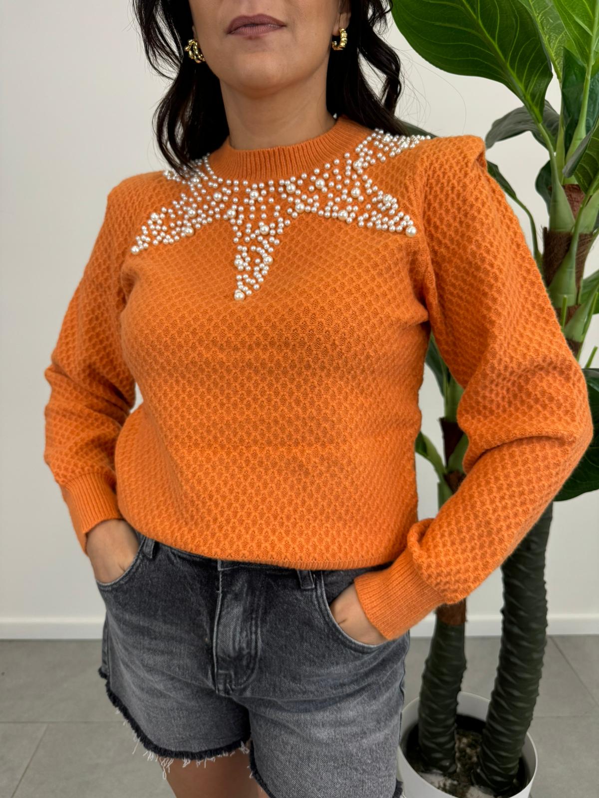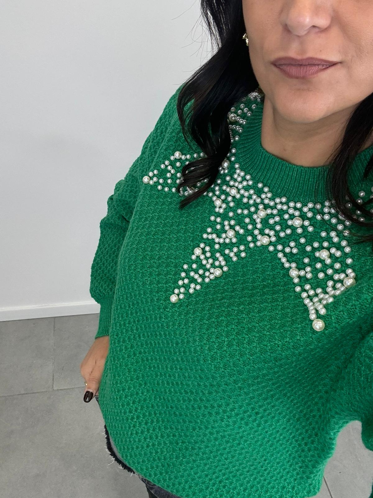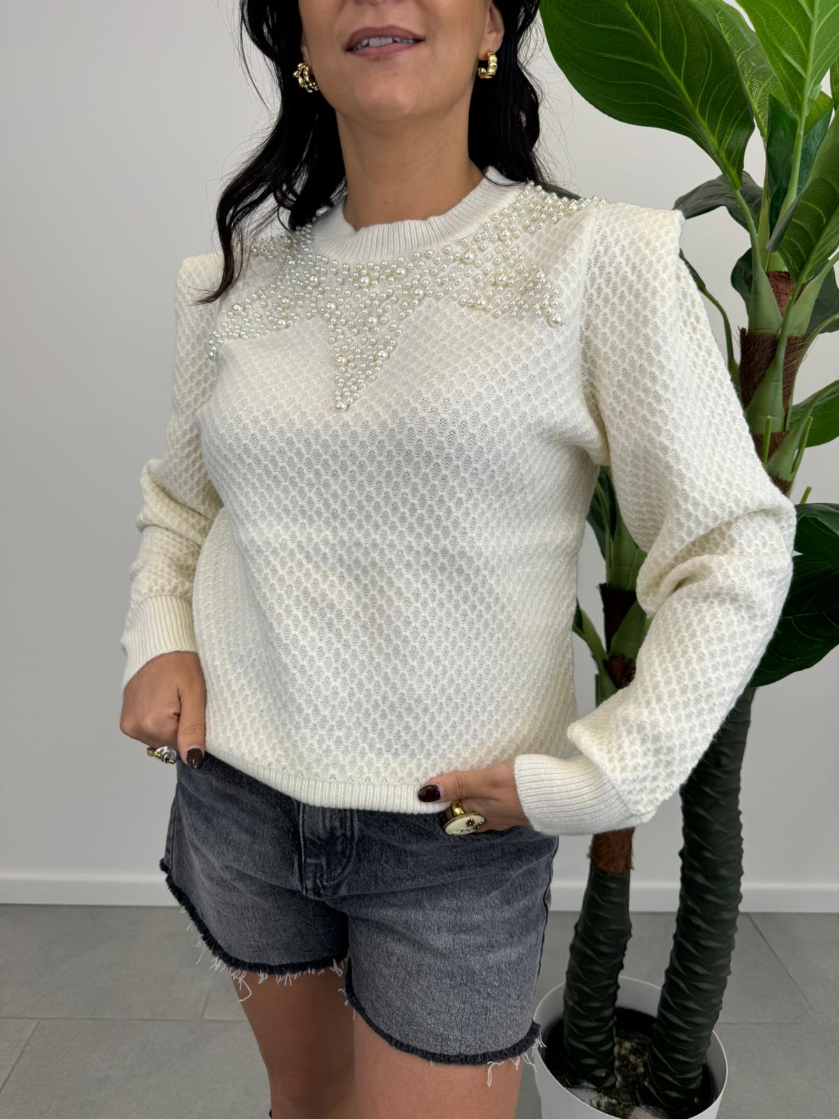 Maglioncino lavorato con applicazione di perle, cinque varianti colore.