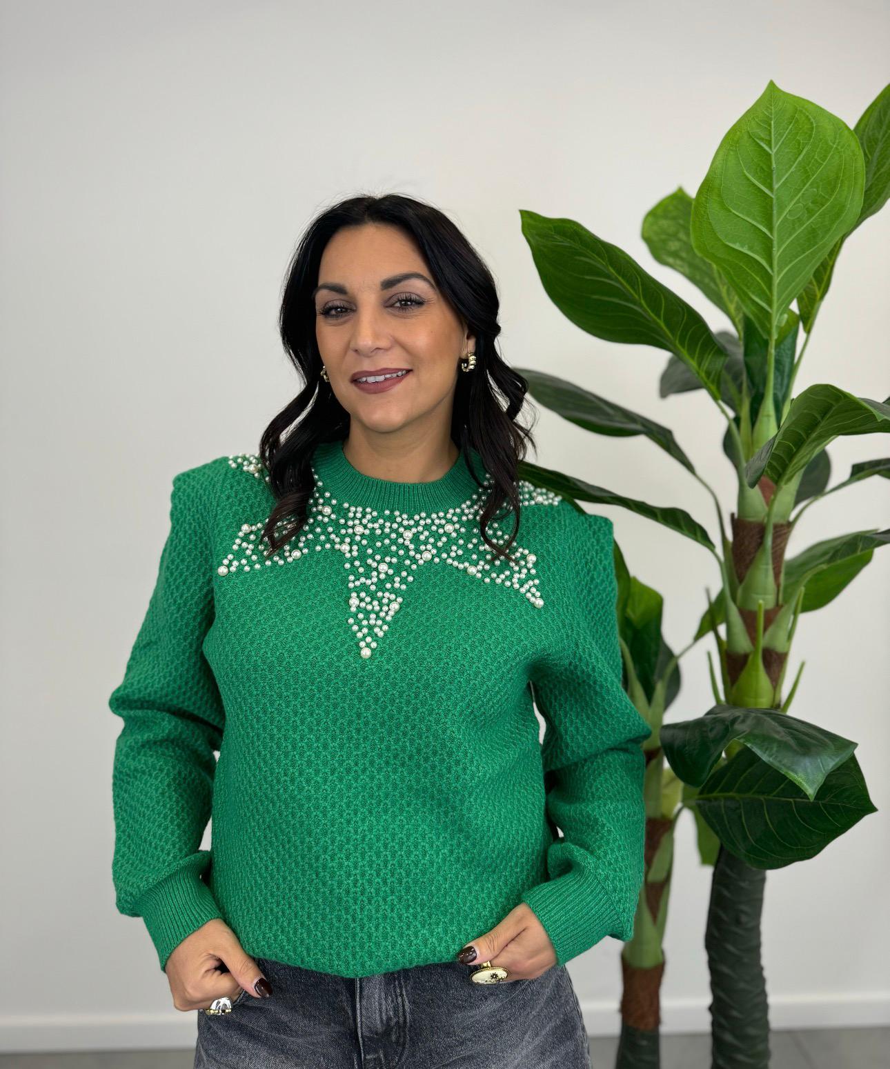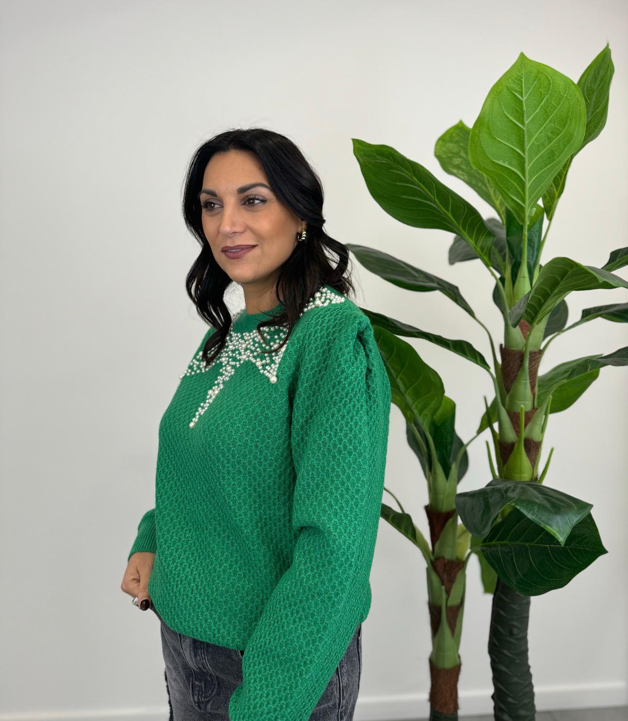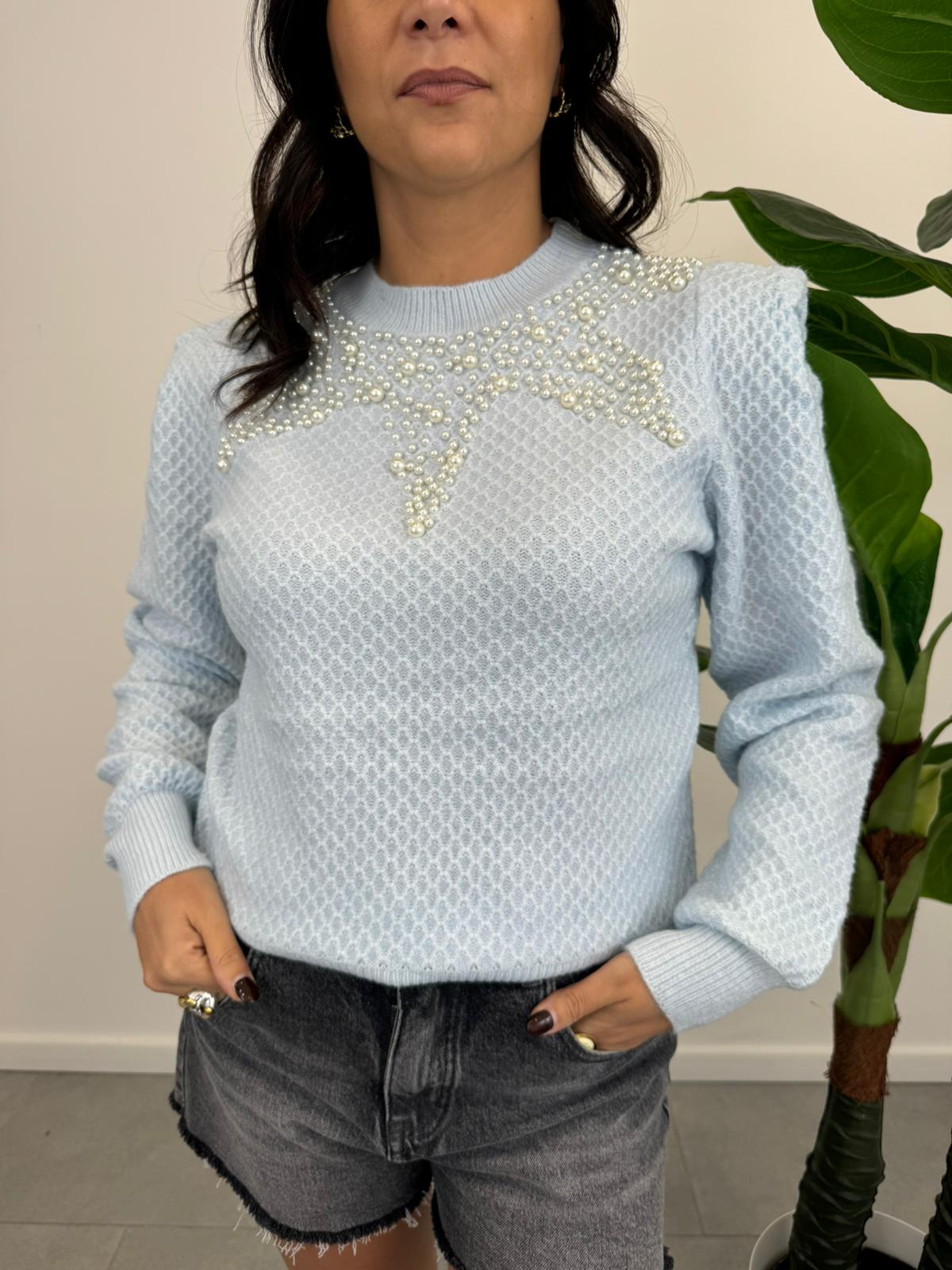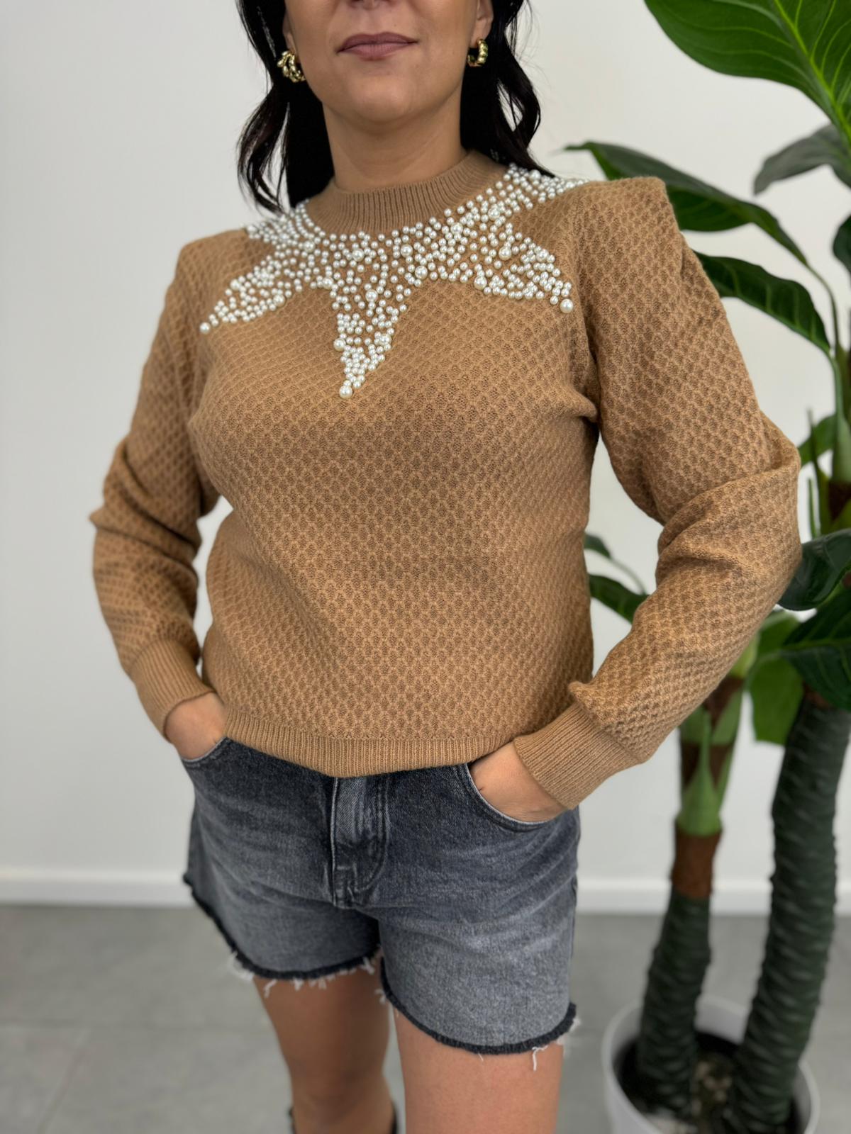 Maglioncino lavorato con applicazione di perle, cinque varianti colore.