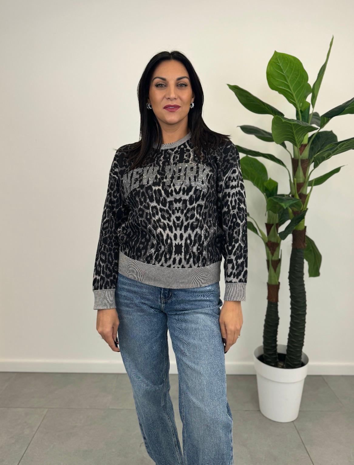 Pull dal taglio morbido e avvolgente, con scollo rotondo. Presenta una fantasia maculata e scritta sul davanti che aggiungono un tocco di modernità.