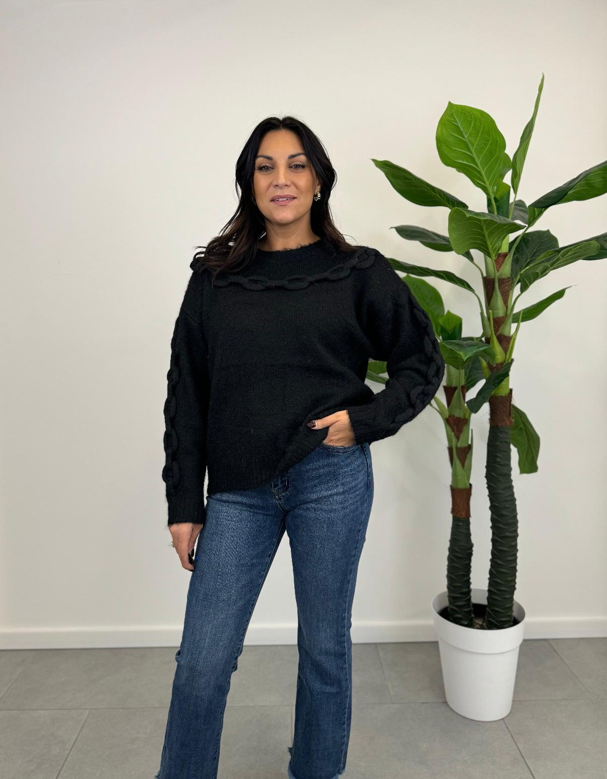 Un maglioncino con dettagli in rilievo a forma di catena, realizzato con un motivo lavorato che crea un effetto tridimensionale e sofisticato.