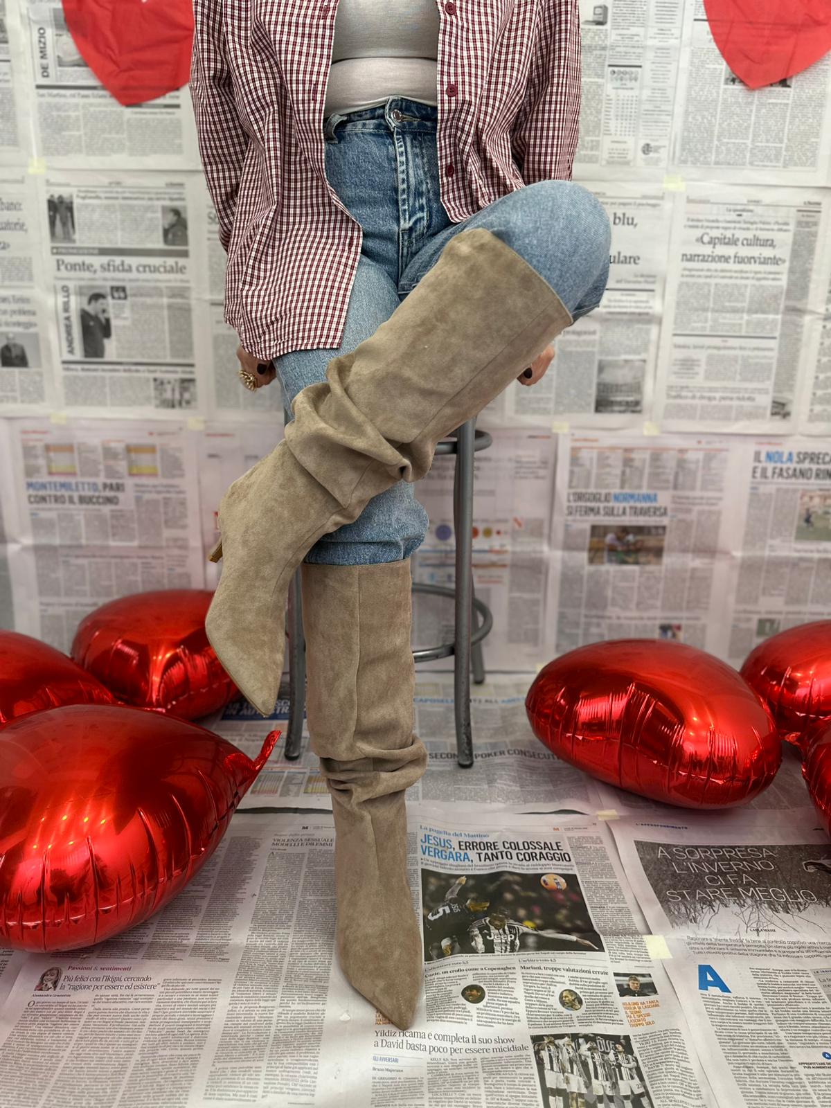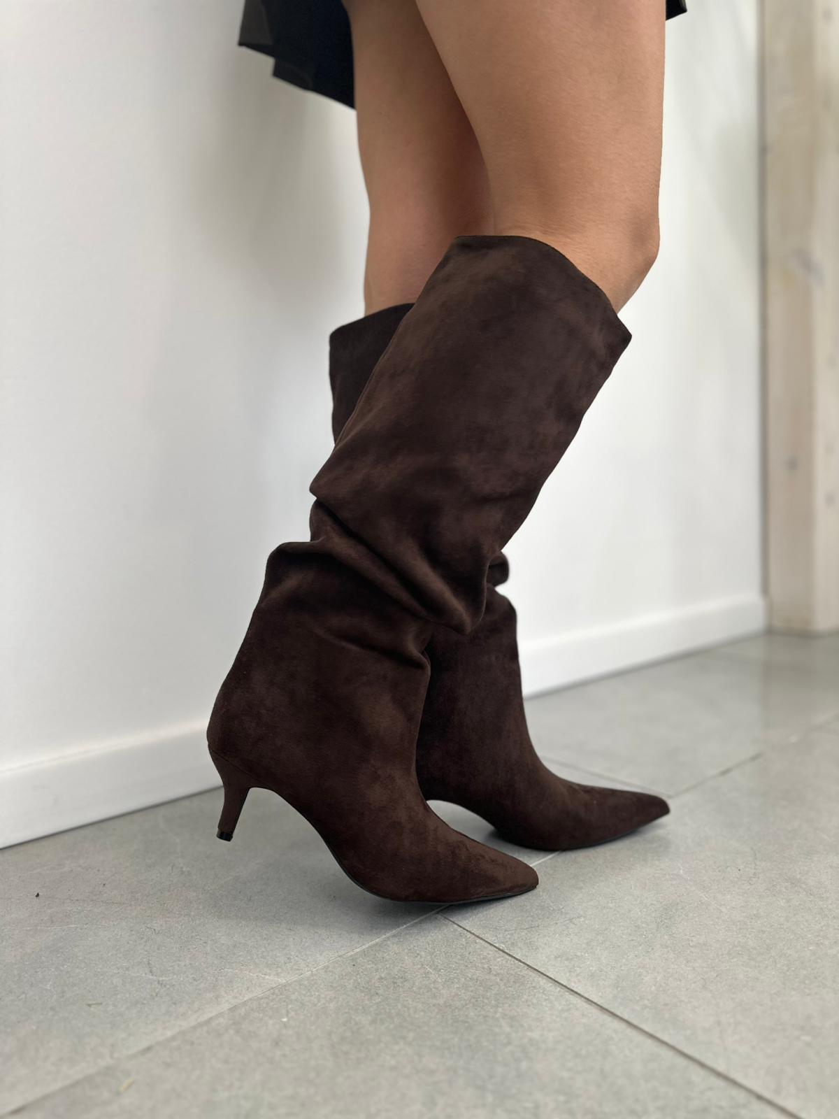 Stivale in camoscio arricciato, con tacco basso e comodo, elegante e pratico.