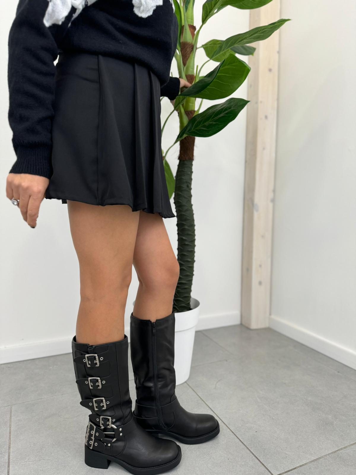 Stivale biker in pelle con fibbie, stile robusto e versatile, perfetto per un look edgy e alla moda.