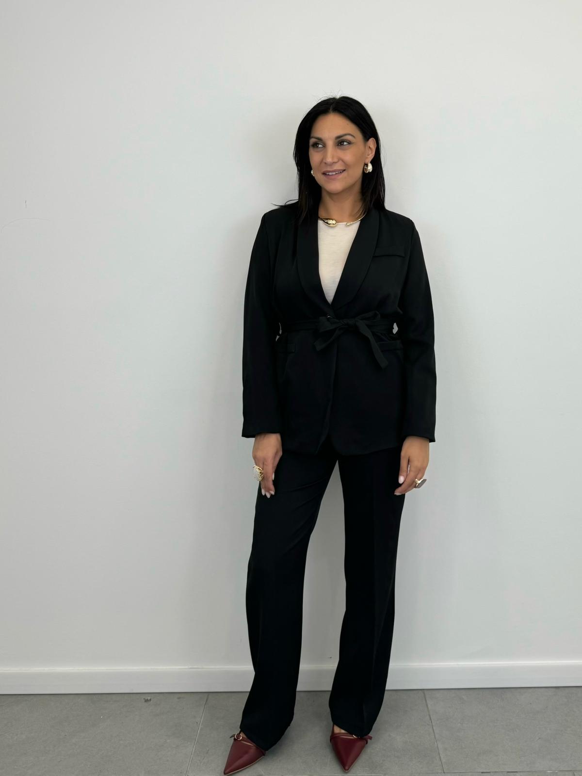 Tailleur composto da giacca dotata di cintura e pantalone gamba dritto con zip laterale ed elastico sul retro.