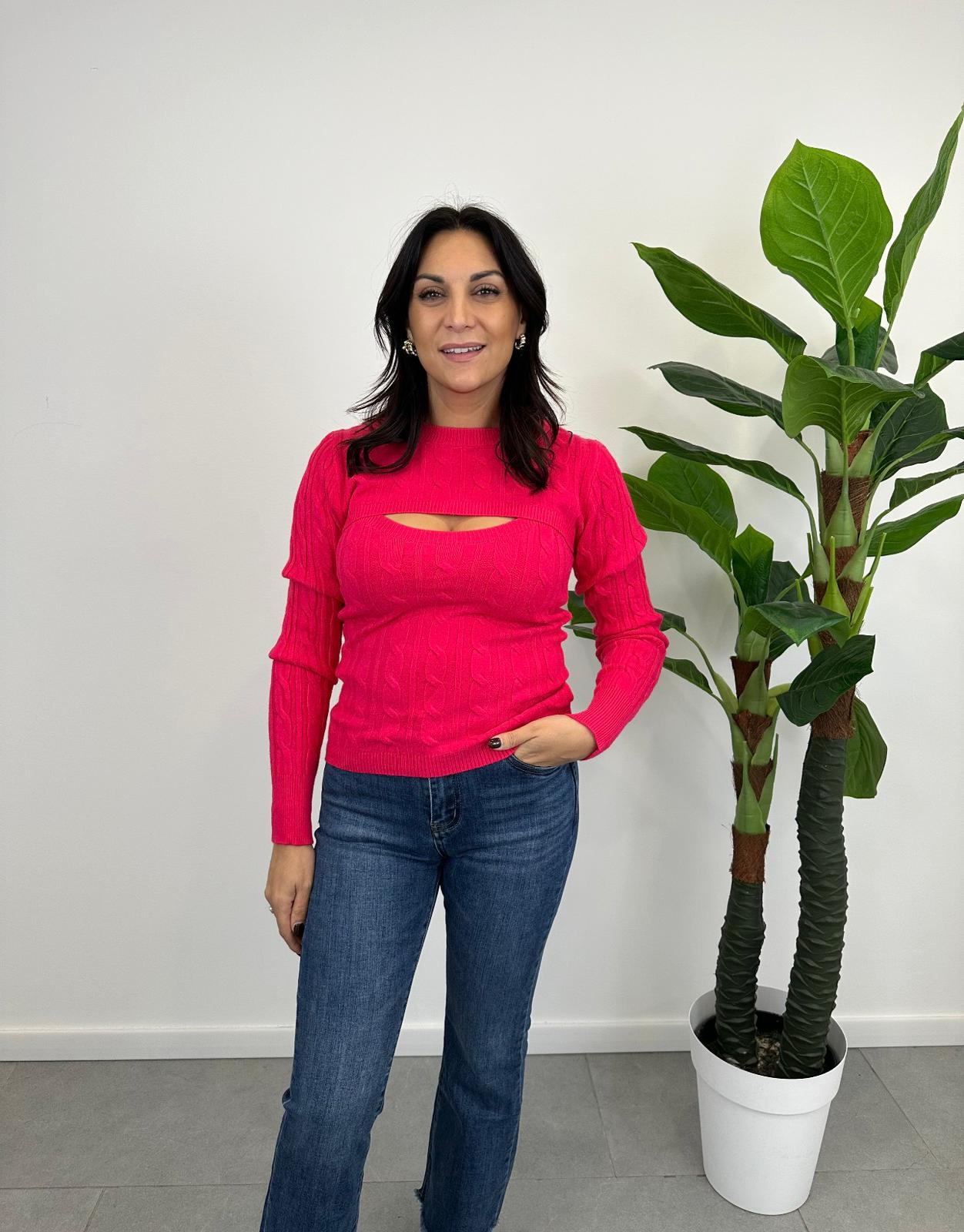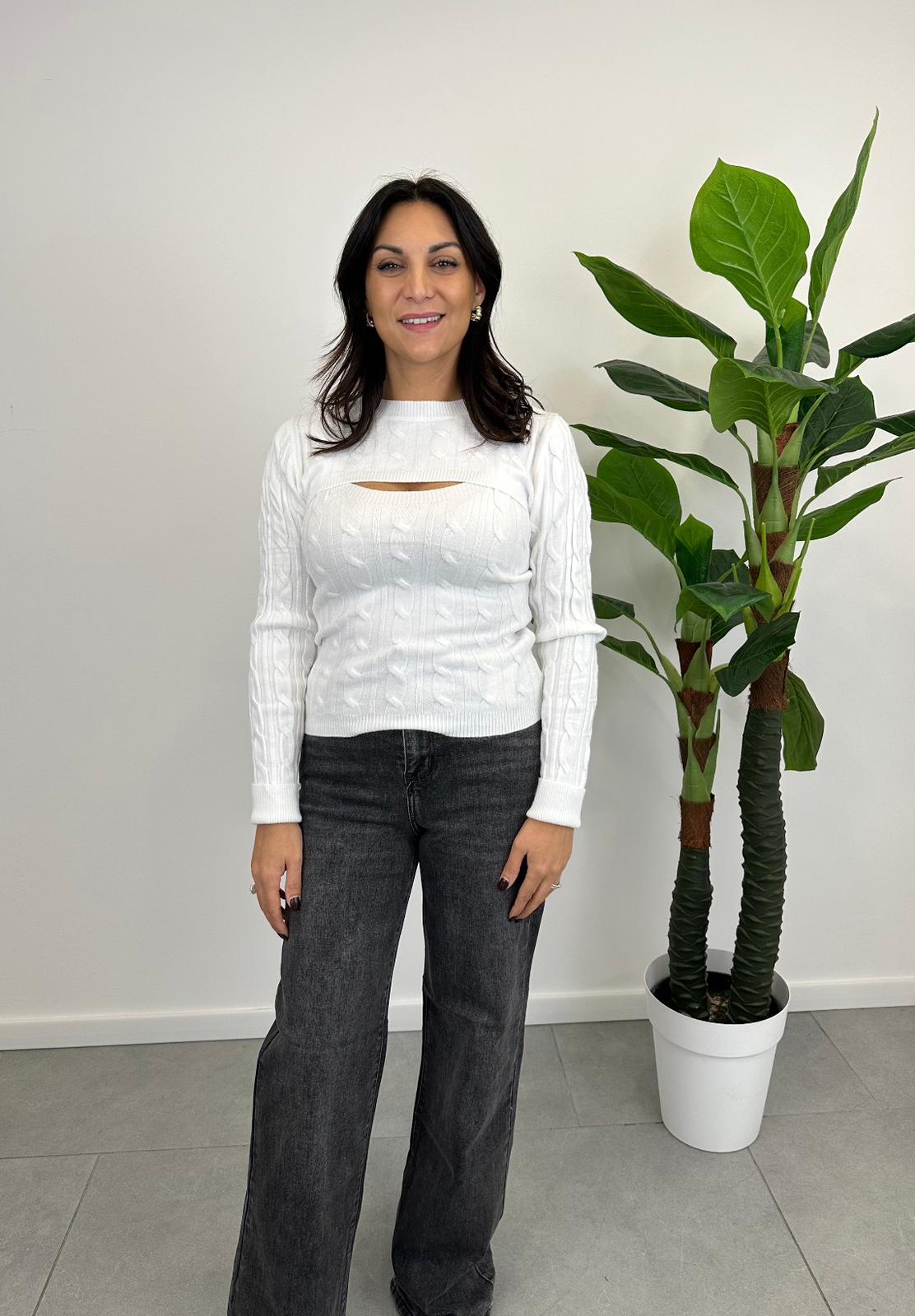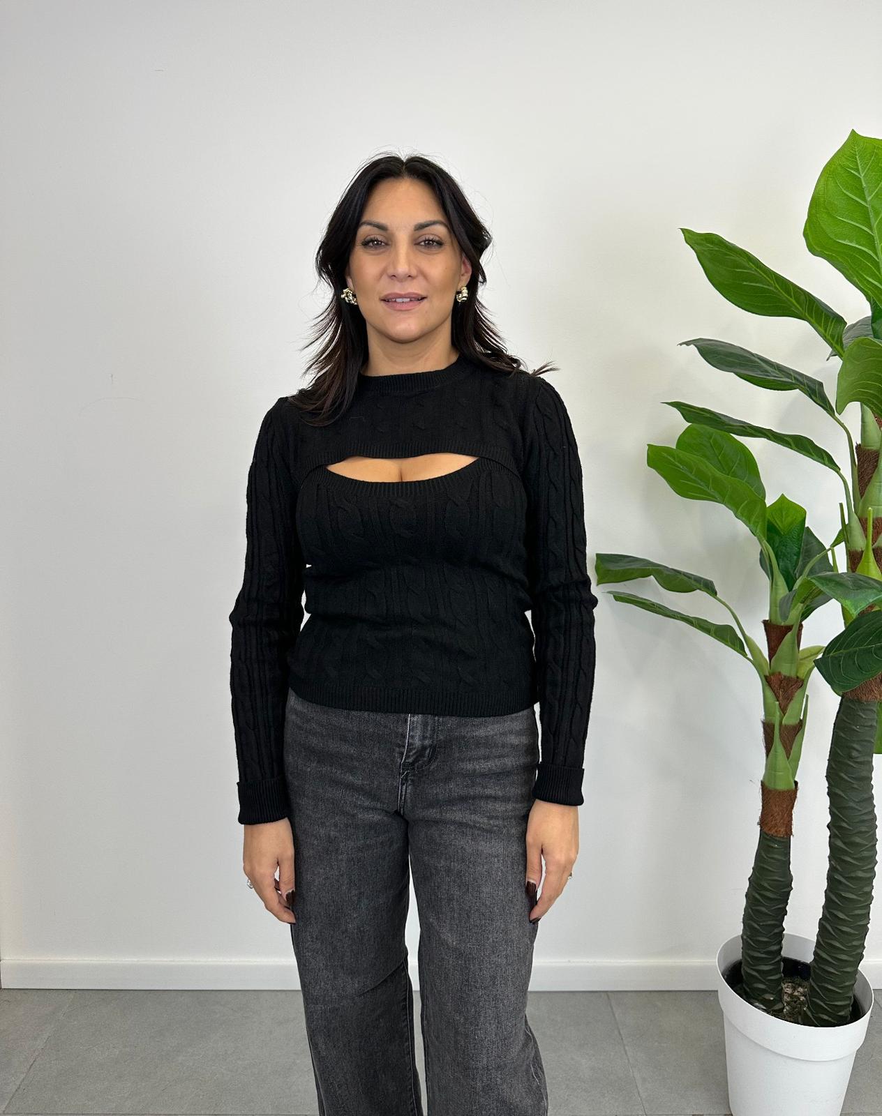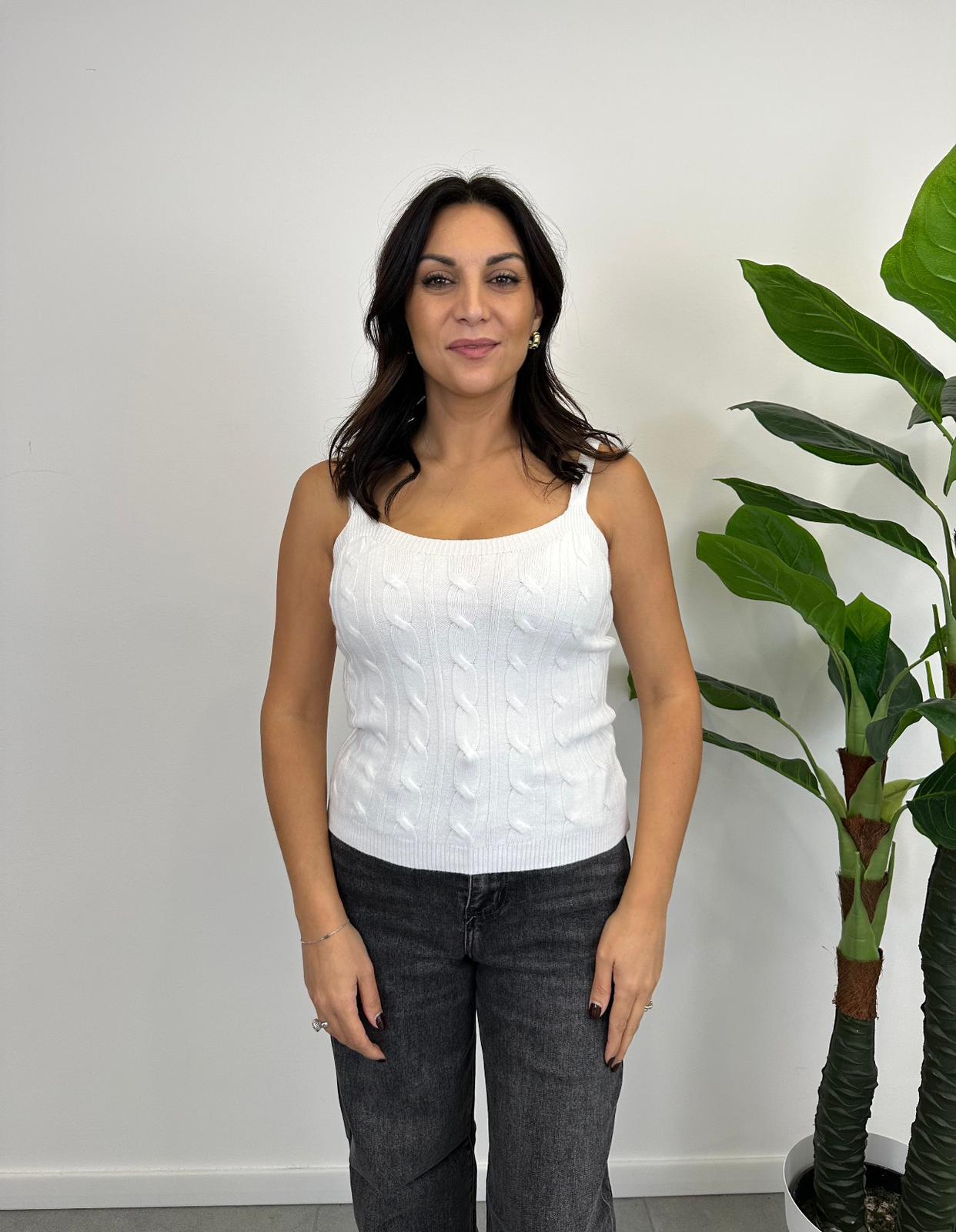 Un twinset composto da coprispalla e top in viscosa, lavorato a trama treccia, elegante e versatile, perfetto per uno stile casual-chic.